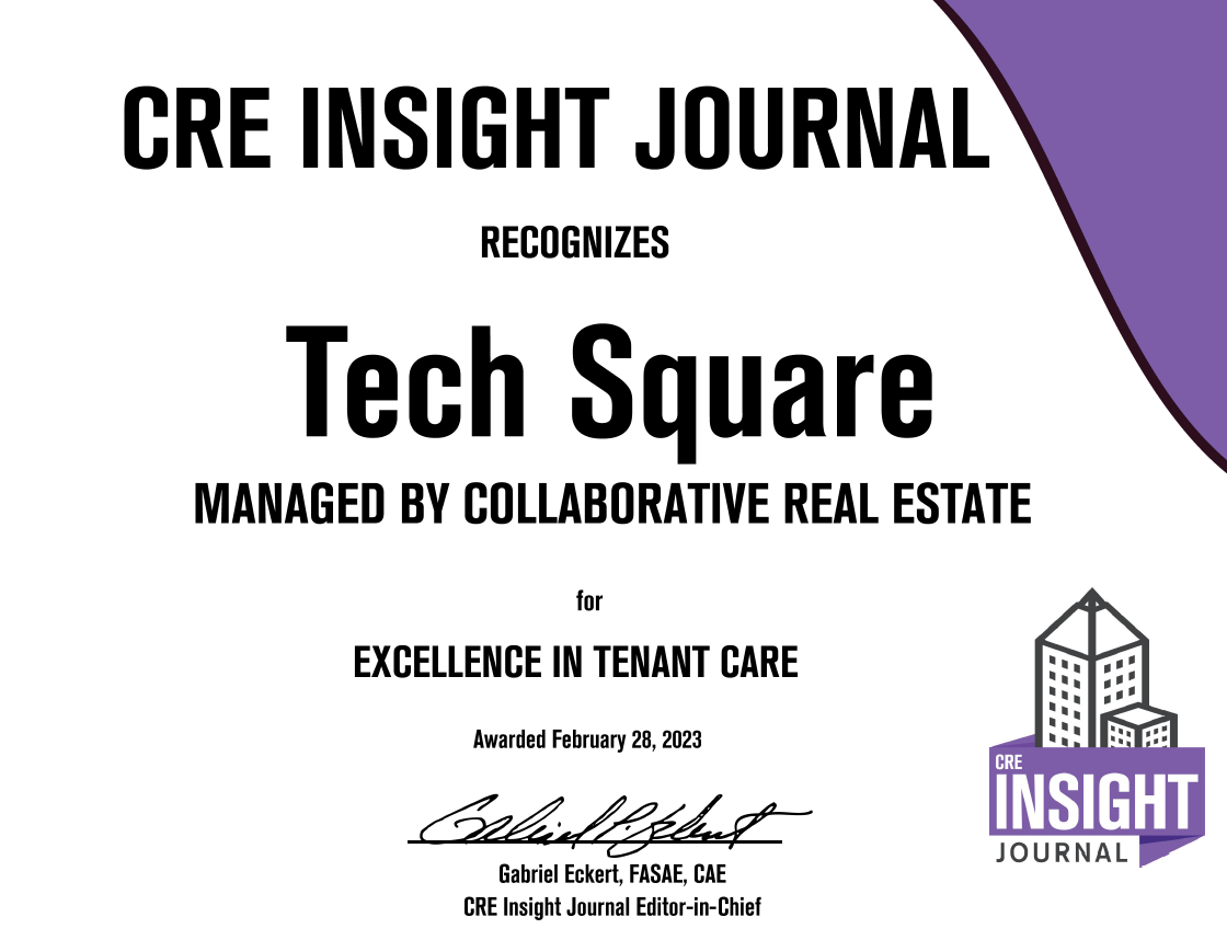 Hosted by CRE Insight Journal, the leading, on-demand resource of articles, webinars, publications, and videos for real estate professionals, Collaborative won the 2022 award for Excellence in Tenant Care regarding their property, Tech Square.